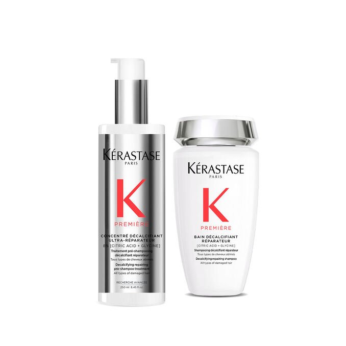 Your stylist begins by applying the Ultra-Repairing Decalcifying Concentrate, then layers it with the Repairing Decalcifying Bath. This duo penetrates deep into the hair fiber for deep, long-lasting repair.